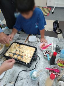 9月20日(土)の活動はクッキング、たこ焼き作りです。いつものように、できることはみんな子どもたちが担当します。キャベツを切ったり、卵を割り入れたり、粉を混ぜたり、上手とは言えないまでもそれぞれ自分なりに一生懸命取り組みました。材料が完成したら、あとはお昼ご飯として焼くだけ。自分で混ぜた生地を焼き器に流し入れ、ほどよく焼けたところでひっくり返す手順も、繰り返すうちに上手になっていきました。具材もたっぷりで大きなたこ焼きが続々と完成。みんなおなかいっぱいになるまでいただきました。