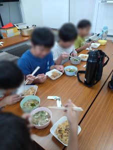 10月11日(土)の活動はクッキング、今回は秋の食材を使った炊き込みご飯を作ります。メインは採れたばかりのサツマイモ。これにシメジなどのキノコ類を合わせて作ります。いつものように、子どもたちは材料を切ったり調味料を計ったり、ご飯を研いだり、それぞれの学年に応じてできる役割を担ってみんなが参加して作ります。炊き込みご飯のほかに今回は豚汁も作りました。お昼には、できたばかりの炊き込みご飯をいただきました。うーん味付けも最高! みんなおなか一杯になるまでおかわりをして、秋の味覚を味わいました!