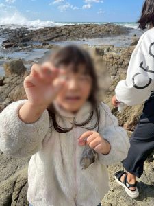 11月1日(土)の活動は、福津市・恋の浦海岸へのお出掛けです。目的は天然石探し。恋の浦海岸は岬と岬にはさまれた美しい砂浜で、動植物の化石をはじめメノウやシーグラスなどの天然石を見つけられることで知られています。当日は早めの昼食をすませていざ出発。海岸に到着すると、子どもたちは天然石を拾うよりも砂浜や岩場で波と戯れることに一所懸命。波打ち際で楽しそうにはしゃいでいます。ひとしきり遊んだ後は宝石探し。砂浜から岩場に移動してみんなで目を凝らして見つけ出し、いくつも拾って帰りました。久しぶりの海で心も体も解放された1日となりました。
