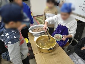 2025年最後の利用日、12月27日(土)の活動は年末にふさわしく年越しそば作りです。そばが苦手な子どものためにうどんも用意しました。午前中から2つのグループに分かれて調理を行い、野菜を切る係やそばをゆでる係など、学年に応じて役割分担をして取り組みました。ちょうどお昼頃にでき上がるように作業を進め、お昼ごはんとしてみんなでいただきます。そばをお椀によそおうことや配膳もすべて子どもたちで行い、みんな一緒においしくいただきました。何杯もおかわりする子どももいて、とても楽しい年越しそば作りになりました。