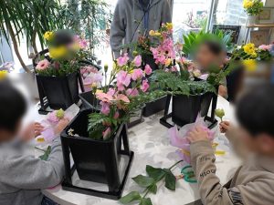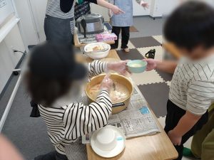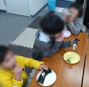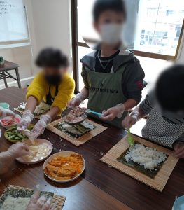 1月31日(土)の活動は節分を前にした季節のイベント、恵方巻作りと豆まきです。午前中は恵方巻作りから。2つのグループに分かれて卵焼きを焼いたり、キュウリを切ったり、それぞれ与えられた役割を子どもたちが担います。できた恵方巻はもちろんお昼ごはんに。今年の方角は南南東とのことなので、みんなでそちらを向いて一斉にかぶりつきました。そして午後からは豆まき。鬼に扮した職員めがけて、子どもたちの容赦ない豆つぶてが飛んできます。ひぃーー。鬼はほうほうのていで退散しましたとさ。