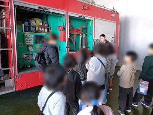 2月21日(土)の活動は、定期的に行っている防災関連の取り組みです。昨年夏の福岡市民防災センターに続き、今回は粕屋南部防災センターでさまざまな災害体験をしました。到着後、まずはシアタールームで地震や火事の備えについて学ぶアニメーションを視聴。続いて、火事の際に煙に巻かれずに逃げる避難体験、震度6の地震体験、台風を想定した強風体験などを行いました。最後は署員の方から消防車や救急車の中を見せていただき、車両の説明を受け、「はたらく車」が大好きな子どもたちは目を輝かせていました。今回の体験は災害の恐ろしさを身をもって知る機会になったと思います。防災への取り組みはぜひ継続していきます。